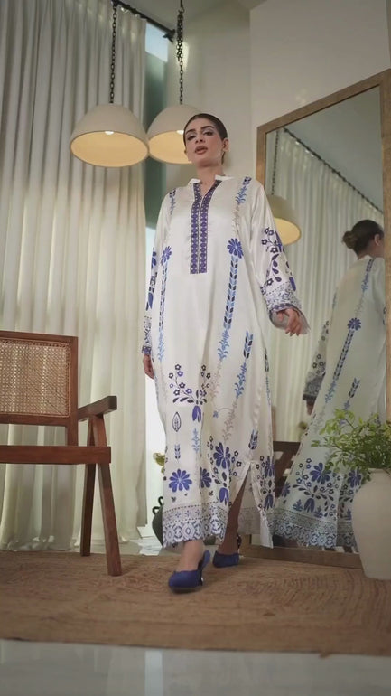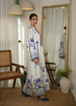 Channel timeless sophistication with porcelain bloom. This breathtaking ankle-length silhouette features a lustrous white base beautifully contrasted by intricate blue floral and geometric motifs, reminiscent of classic ceramic art. The design is elevated by a detailed central neckline placket embellished with subtle crystal accents, and finished with wide statement cuffs featuring a striking mosaic-style border.
