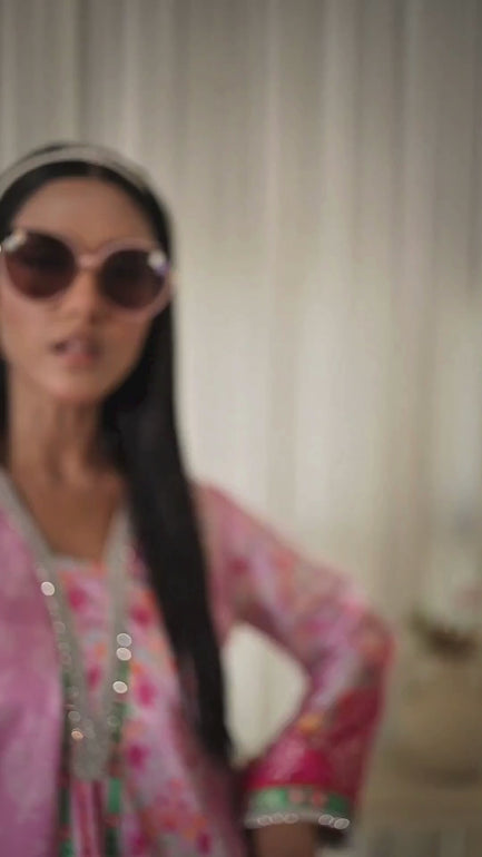 Embrace the romance of the season with rose tinted day. This radiant ensemble features a glossy candy-pink kurta adorned with a whimsical mix of vibrant florals and subtle heart motifs. The v-neckline sparkles with metallic silver trim, while the sleeves and hem are finished with bold magenta borders and delicate hanging beads. The look is balanced perfectly with contrasting plain white textured wide-leg trousers for a fresh, daytime vibe.